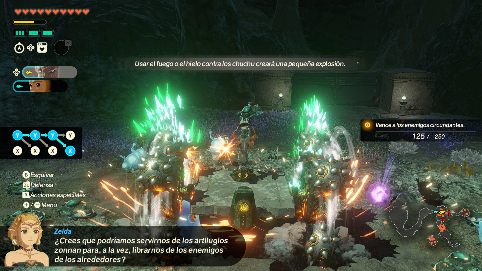 Toda esa estructura de combate se expande con los artilugios Zonnan, que adoptan aquí un rol protagonista. A medida que progresas van apareciendo dispositivos que cualquier jugador de Tears of the Kingdom reconocerá al instante: el igneocéfalo que escupe fuego, el criocéfalo que congela al mínimo contacto, cañones, turbinas que devuelven ataques enemigos e incluso globos aerostáticos para moverse por el mapa. Todos dependen de baterías que se recargan durante el combate y, igual que ocurría en TOTK, su efectividad depende del entorno: un criocéfalo en un charco hace verdaderos estragos.