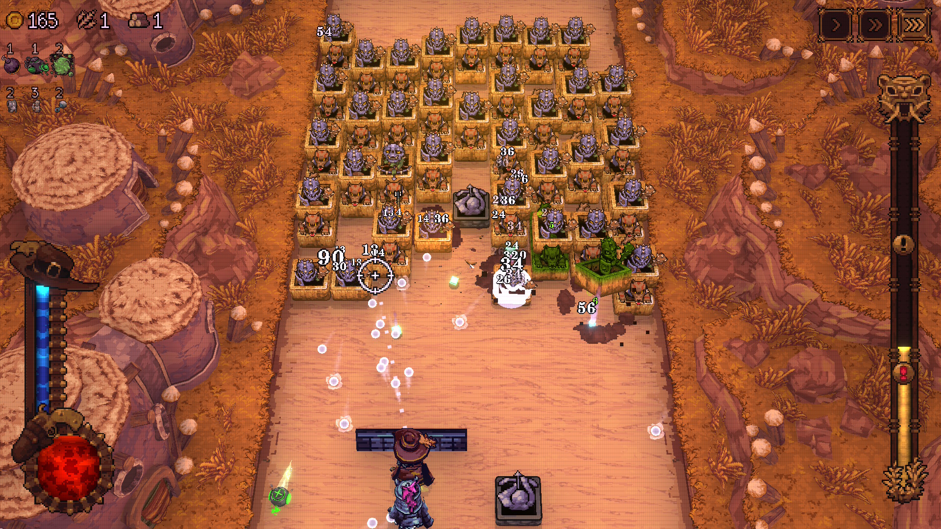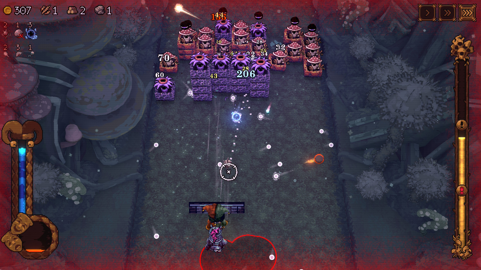 Ball x Pit se basa en 2 partes bien diferenciadas, pero que se completan entre ellas. Tenemos las fases de acción y las fases de gestión y creación del poblado. En las fases de acción tendremos que ir superando los distintos niveles del foso. Tenemos un personaje que puede moverse en varias direcciones en un pasillo. Este pasillo avanza de forma automática de forma constante y a medida que ocurre esto van apareciendo distintos enemigos. Nuestro personaje dispara de forma automática y nuestra misión es apuntar. Las bolas que lanzamos pueden ser de 2 tipos, las normales y las especiales. Las normales son las básicas, pequeñas y que no hacen especialmente mucho daño.