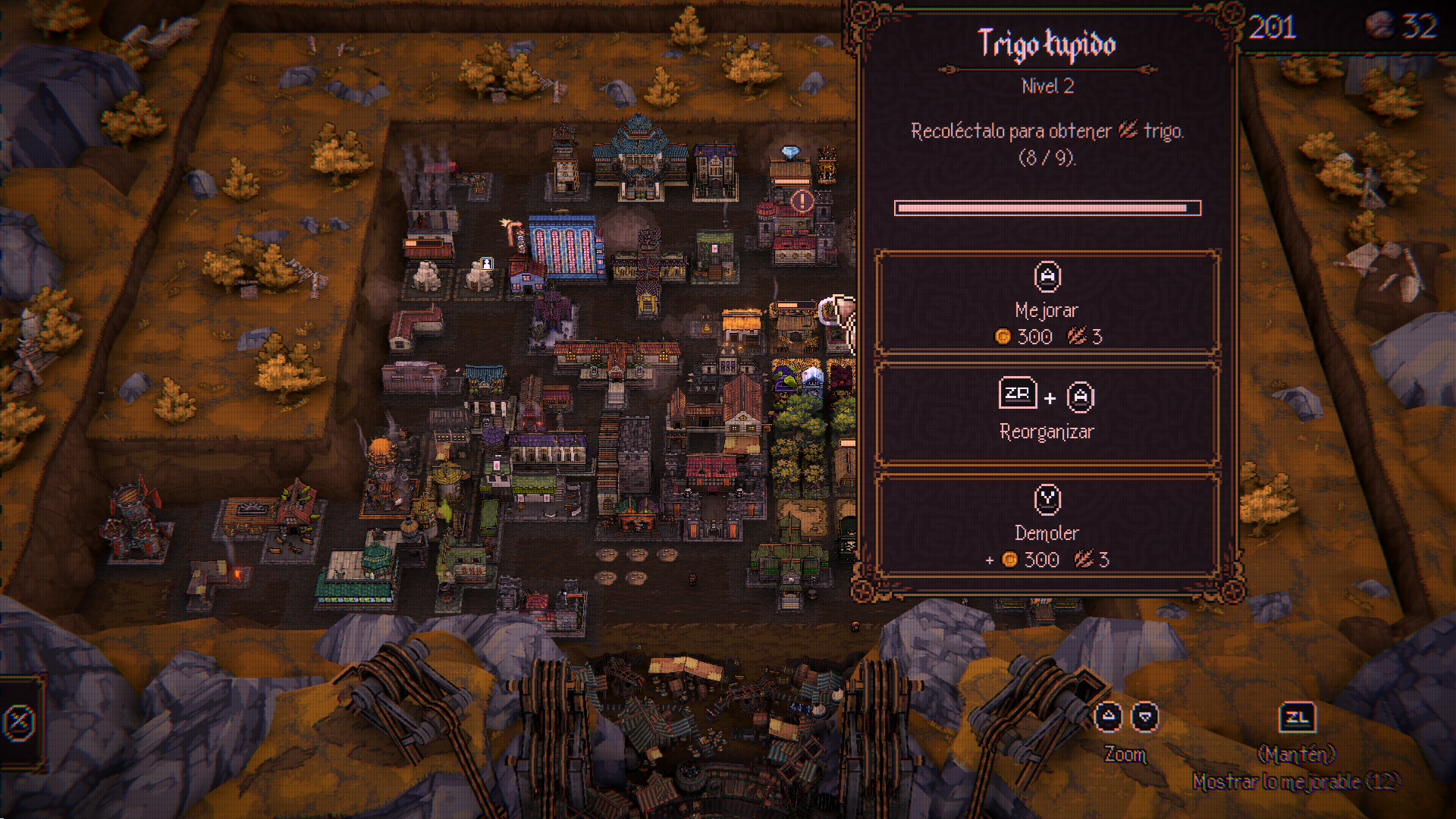 Ahora tenemos que hablar de la otra parte, la gestión y creación de Nueva Ballbylon. Después de cada nivel podemos crear nuestra base y tenemos muchas opciones y tipos de edificio para ellos. Primero tenemos los edificios de recursos, como son granjas, bosques, canteras y demás para conseguir los cuatro recursos necesarios para poder construir, oro, trigo, madera y piedra. Luego tenemos los edificios de mejoras, que sirven para mejorar los atributos de nuestros personajes de forma permanente, como son la fuerza de las bolas, velocidad, salud del personaje. Hay hogares, que son los distintos edificios que nos darán nuevos personajes una vez los construimos.