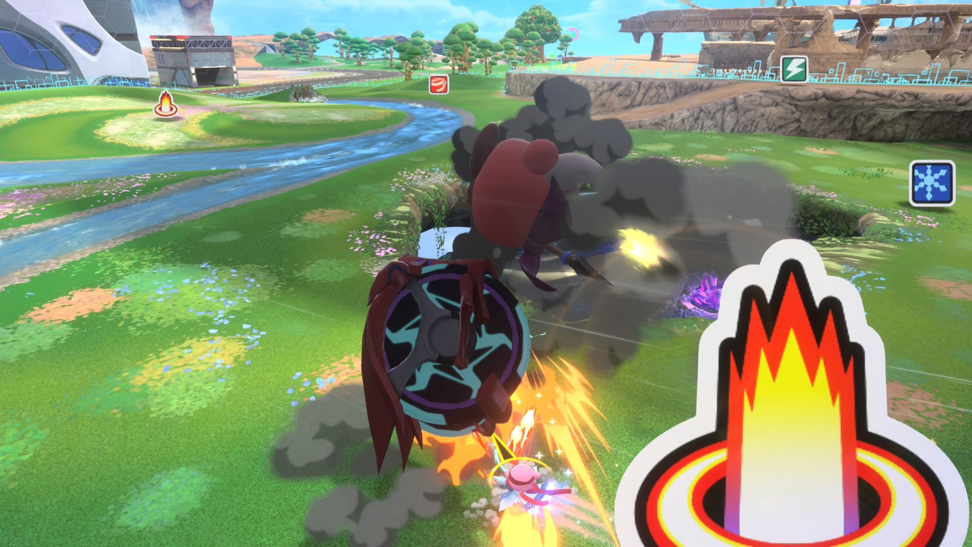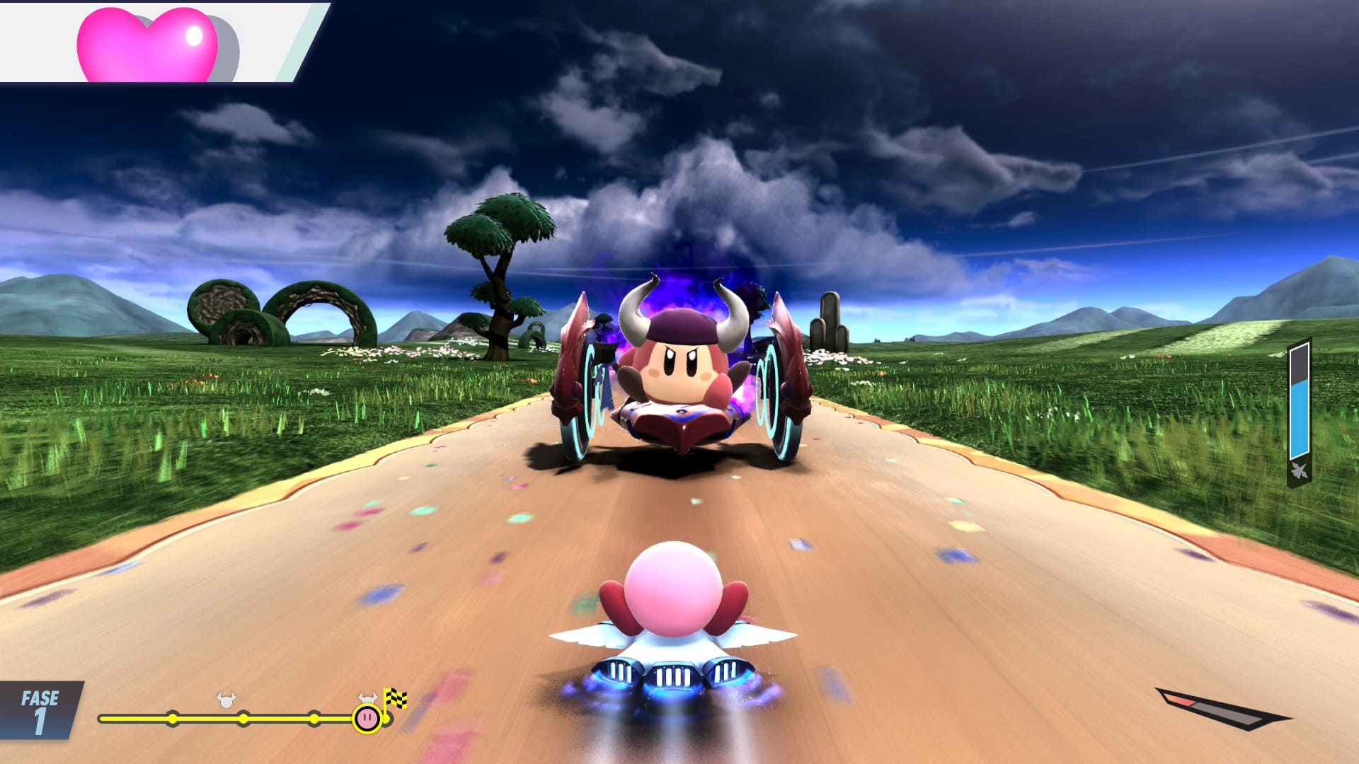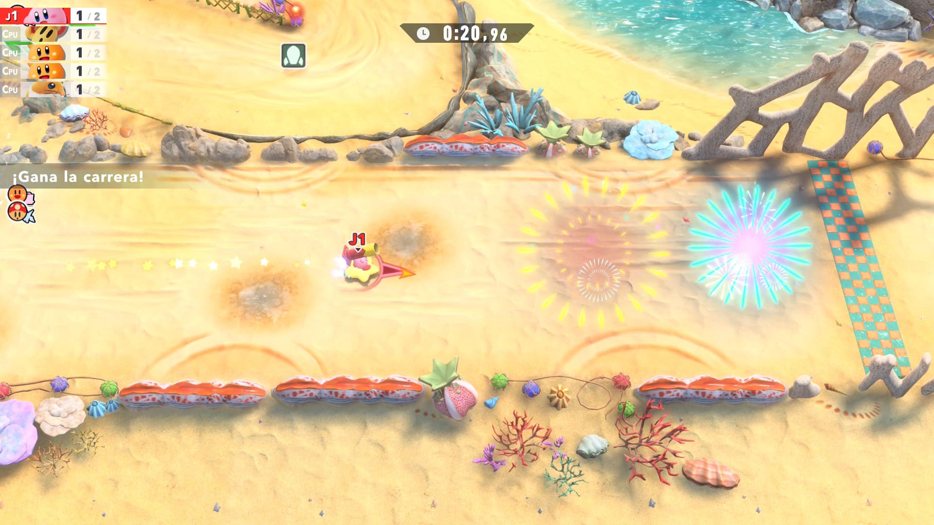 Los circuitos y escenarios son otro punto fuerte. Aunque mantienen la simplicidad visual característica del título, Sakurai y su equipo han integrado trucos visuales, efectos explosivos y detalles dinámicos que lucen de maravilla a toda velocidad. Los personajes también brillan por sí mismos, con animaciones adorables y fluidas, con la posibilidad de personalizar colores, objetos y efectos.