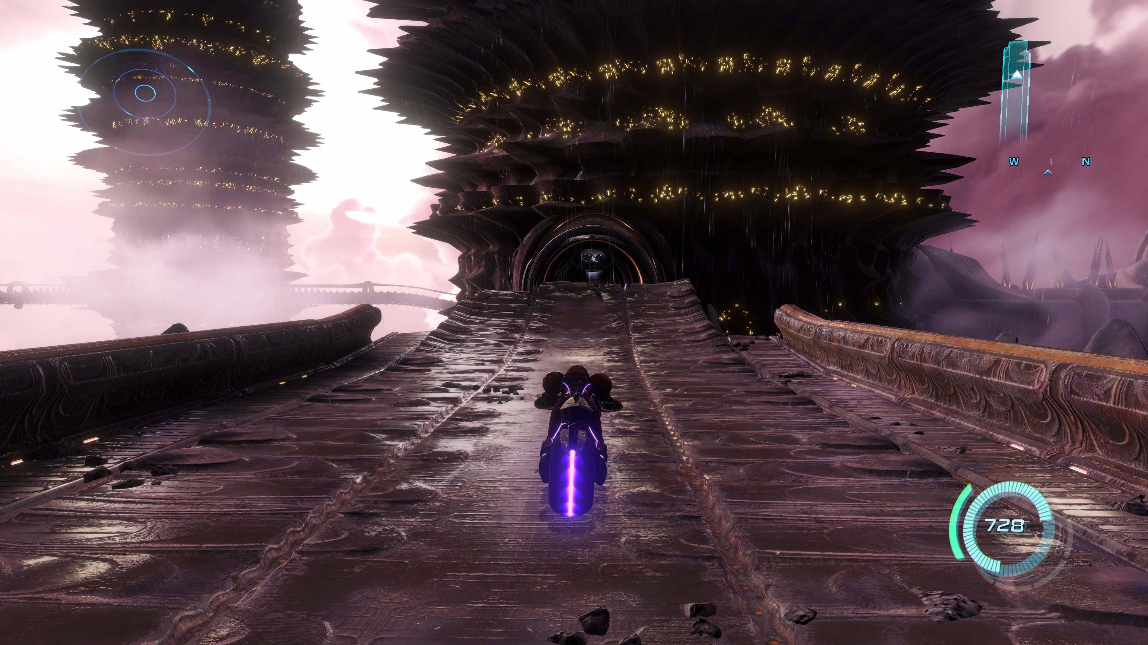 Aquí entra en juego VI-O-LA, la moto de Samus. A nivel de control, funciona sorprendentemente bien: subirse y bajarse es rápido, casi tan orgánico como entrar en la morfosfera, y durante los primeros trayectos resulta incluso divertida. El problema no es la moto, sino cómo se utiliza. Podría haber sido un sistema completo de exploración, con mejoras, rutas alternativas, combates específicos o integración metroidvania… pero se queda en un simple medio de transporte obligatorio.