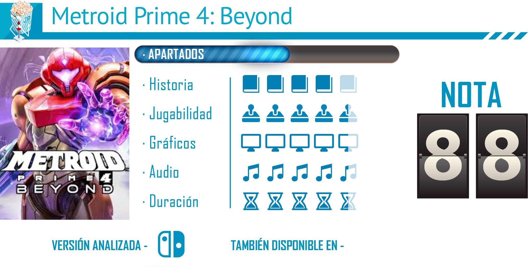 Metroid Prime 4: Beyond es una vuelta sólida y reconocible al universo Prime, un juego que se disfruta desde el primer minuto gracias a unos controles impecables, una ambientación cuidada y unos combates —especialmente los jefes— que mantienen viva la esencia de la saga. Sin embargo, esa fidelidad al pasado juega también en su contra: la excesiva linealidad, el diseño demasiado guiado y un HUB desértico que rompe el ritmo hacen que la exploración pierda peso y que muchas ideas interesantes se queden a medio gas. Es una aventura agradable, accesible y bien ejecutada, pero también conservadora, que cumple sin brillar y deja la sensación de que Retro Studios tenía entre manos la oportunidad perfecta para redefinir la saga… y decidió no arriesgar.