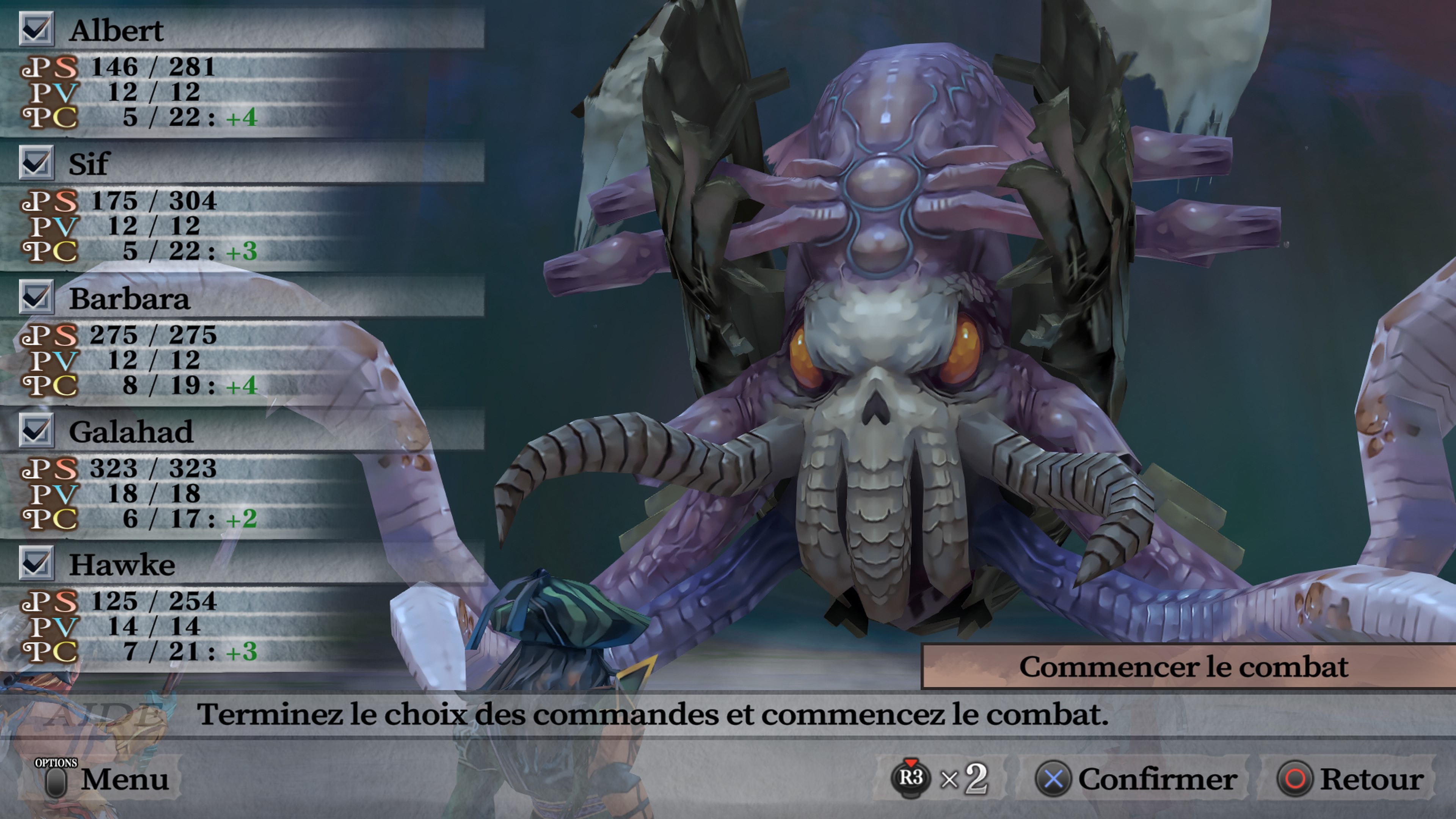 En combate, cada personaje actúa según su agilidad, sin un orden fijo de turnos. Se pueden equipar hasta cuatro armas, aprender técnicas específicas según su uso y gestionar tres recursos clave: los Puntos de Batalla (PB), los Puntos de Durabilidad (PD) y los Puntos Vitales (PV). Estos últimos son especialmente delicados, ya que al llegar a cero pueden provocar la muerte permanente del personaje, y solo se recuperan descansando en posadas. Todo esto convierte cada enfrentamiento en un ejercicio constante de planificación.