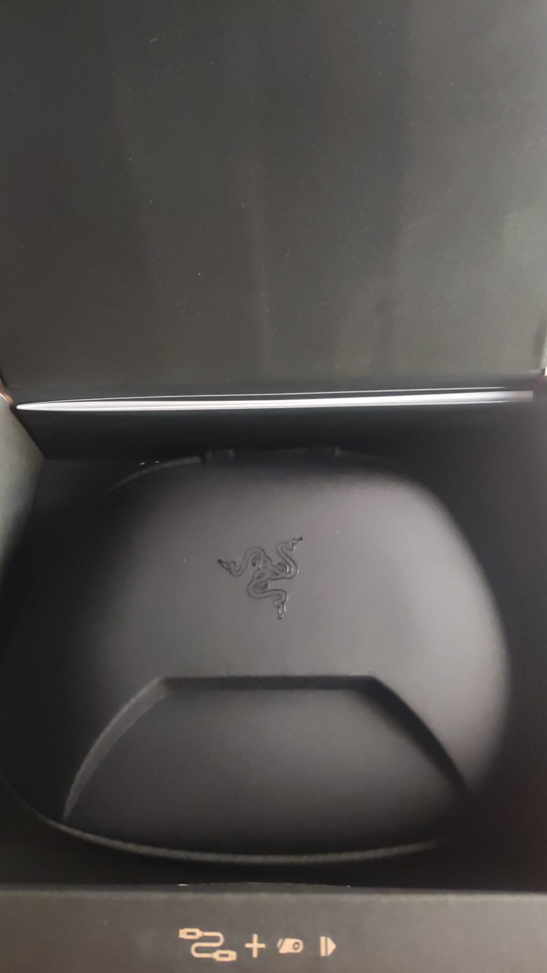 La funda cuenta con un acabado textil suave al tacto y una estructura rígida que protege eficazmente el mando durante el transporte. Se cierra mediante una cremallera y dispone de una pequeña asa en la parte superior para facilitar su manejo. El único elemento decorativo visible es el logotipo de Razer, situado en la tapa superior, manteniendo una estética elegante y sin estridencias. Al abrirla, además del mando, encontramos algunos detalles prácticos adicionales.