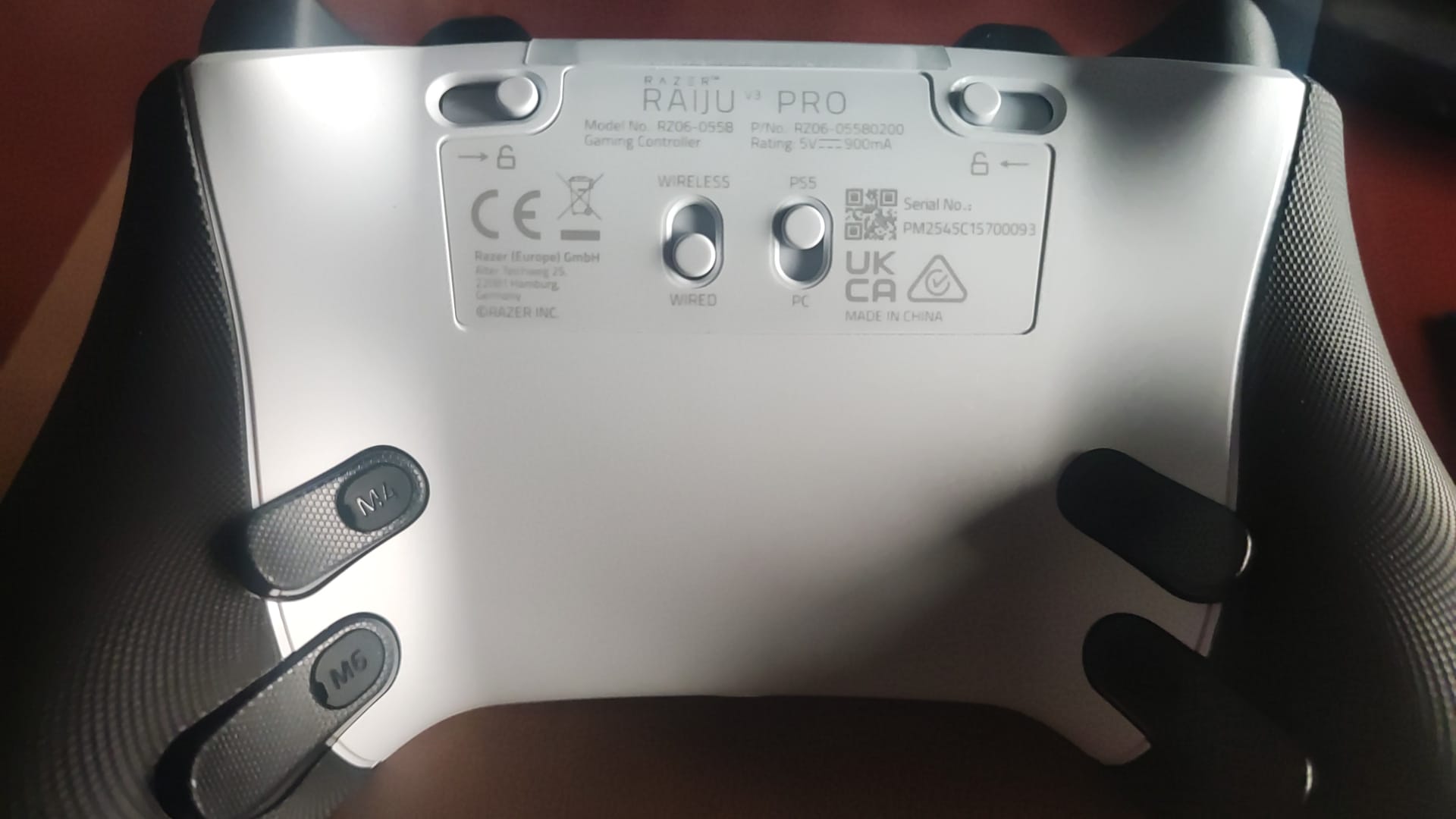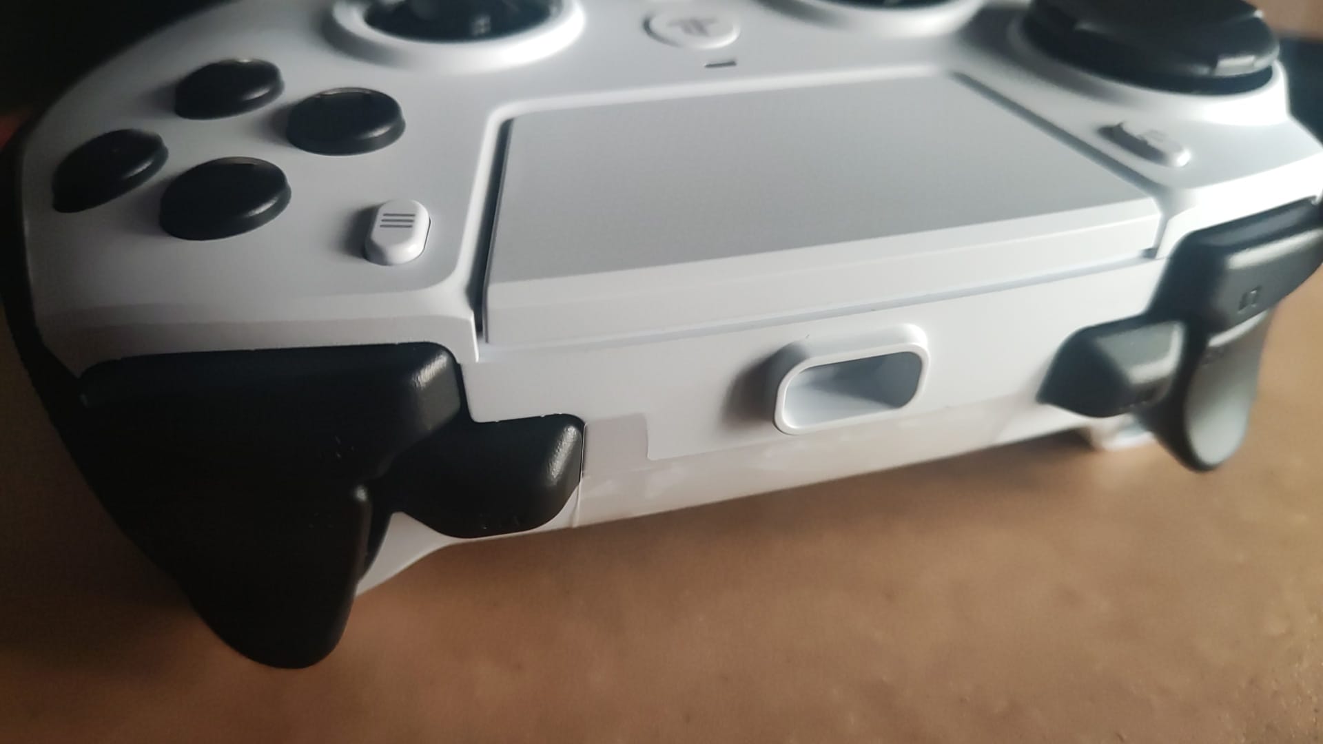 La parte inferior del mando es donde se concentran muchas de sus funciones avanzadas. A ambos lados, junto a los gatillos, encontramos dos interruptores que permiten bloquear el recorrido de L2 y R2, transformándolos en botones de pulsación rápida digital. Es un sistema pensado claramente para juegos competitivos, donde cada milisegundo cuenta, y que resulta especialmente útil en shooters.