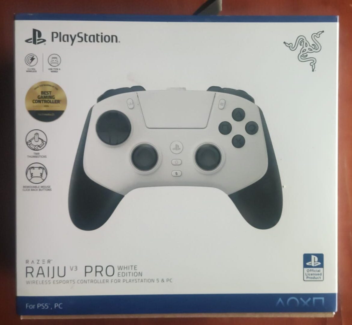 El Razer Raiju V3 Pro llega en un embalaje que deja clara desde el primer vistazo su orientación hacia PlayStation 5. La caja exterior combina el blanco y el azul característicos del ecosistema de Sony, con una presentación limpia y muy reconocible. En el frontal destaca una imagen del mando —en nuestro caso, en acabado negro y blanco— acompañada de algunas de sus especificaciones más relevantes, como el uso de sticks TMR, la posibilidad de jugar tanto por cable como de forma inalámbrica o la presencia de botones intercambiables.