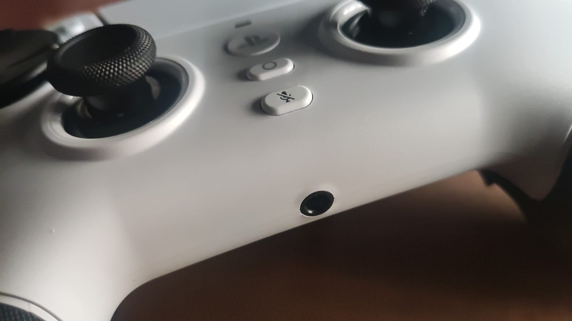 En la parte superior central se integra el habitual panel táctil, acompañado por los botones de opciones, compartir, el botón de PlayStation y el control para silenciar el micrófono. Entre ambas empuñaduras se ha colocado un conector minijack de 3,5 mm, que permite conectar auriculares con cable directamente al mando, replicando una de las funciones más prácticas del DualSense.