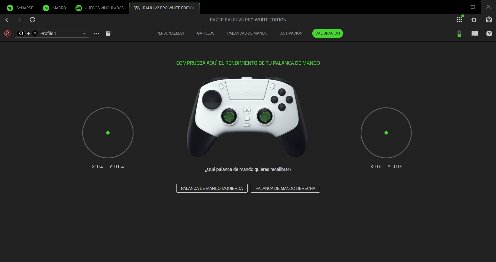El último apartado es el de calibración. Desde aquí se puede comprobar el comportamiento de los sticks y recalibrarlos si fuese necesario. Aunque el Razer Raiju V3 Pro utiliza tecnología magnética en sus palancas, lo que reduce al mínimo el riesgo de descalibración o de aparición de drift, se agradece contar con esta opción como medida preventiva.