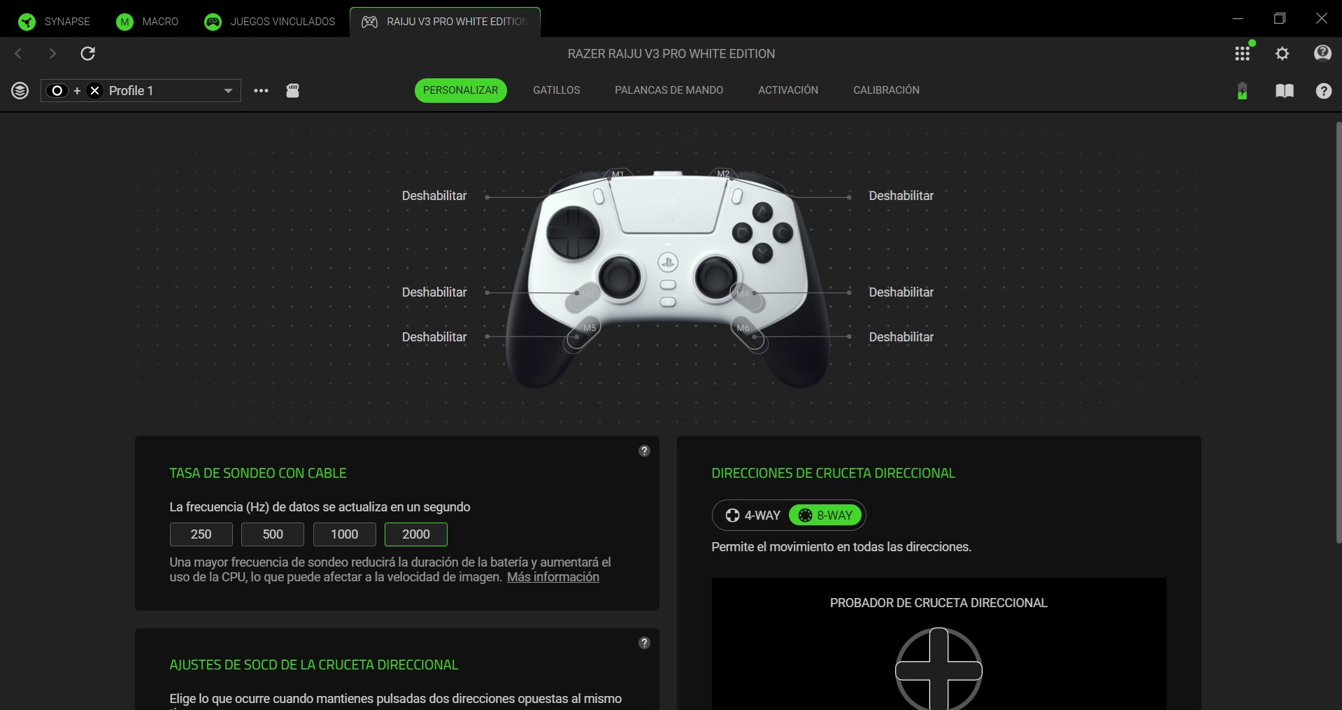 Una vez dentro de Synapse, el mando aparece listado como un dispositivo más y da acceso a todos sus apartados de configuración. El primero de ellos está centrado en la personalización general. Desde aquí podemos asignar funciones a los botones adicionales, modificar la tasa de sondeo cuando el mando está conectado por cable, elegir el tipo de cruceta que queremos utilizar y definir cómo debe comportarse cuando se pulsan dos direcciones a la vez.