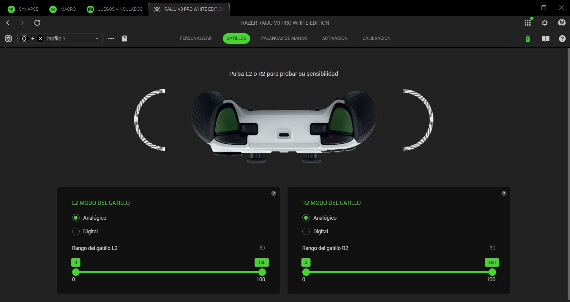 El siguiente bloque está dedicado a los gatillos. En este apartado es posible decidir si queremos que funcionen como gatillos analógicos tradicionales o como botones digitales de respuesta inmediata. Además, se puede ajustar el rango de recorrido, lo que permite adaptarlos tanto a juegos de conducción como a shooters competitivos, reforzando la versatilidad del mando.