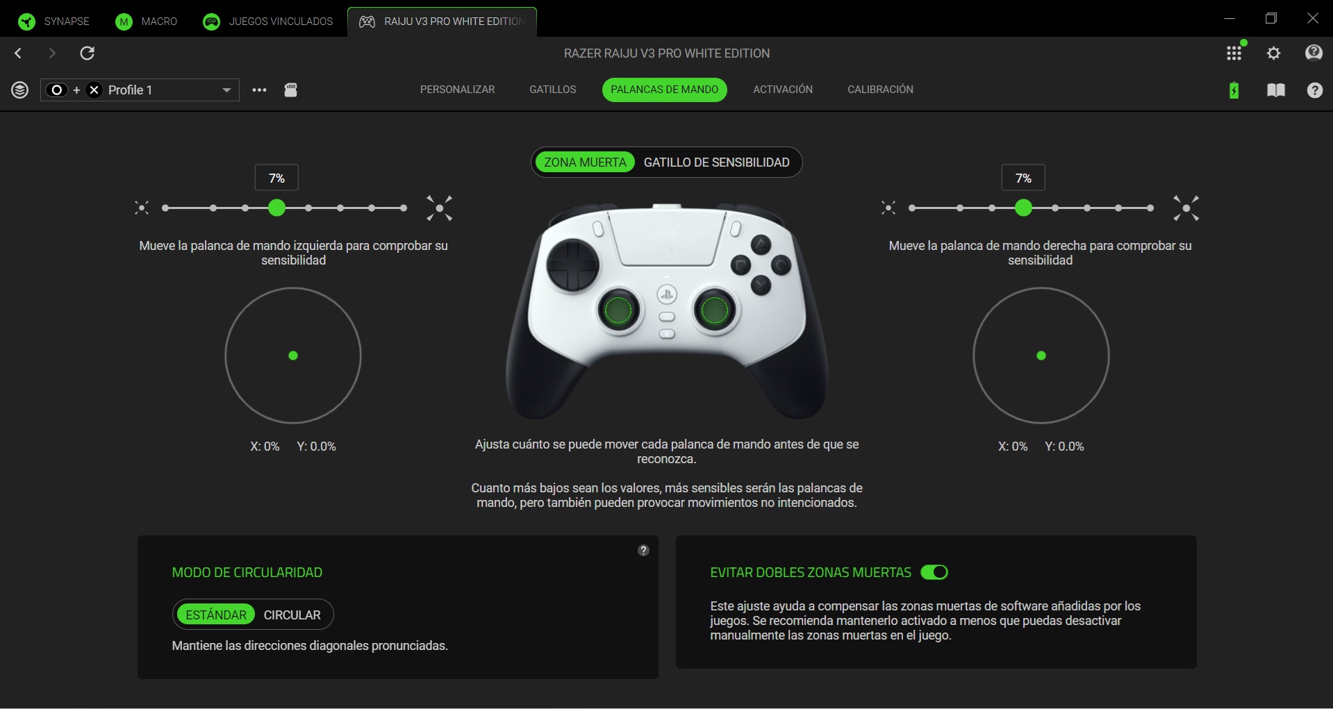 A continuación, encontramos la configuración de las palancas analógicas, es decir, de los sticks. Desde aquí se pueden definir las zonas muertas, ajustar el modo de circularidad y activar una opción especialmente interesante llamada “evitar dobles zonas muertas”. Esta función resulta muy útil en títulos que ya incluyen su propia zona muerta en los ajustes internos, evitando que se superpongan y afecten negativamente a la precisión del control.