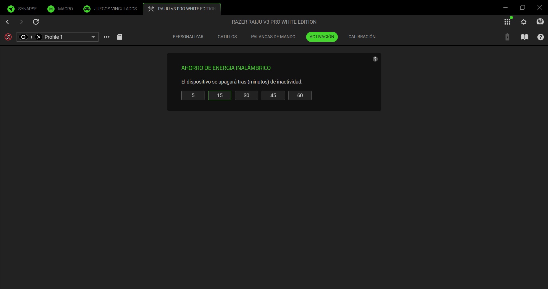 En la pestaña dedicada a la activación se gestiona el comportamiento del mando en reposo. Aquí podemos establecer el tiempo que debe pasar antes de que se apague automáticamente para ahorrar batería, un detalle sencillo pero importante para optimizar su autonomía durante el uso diario.